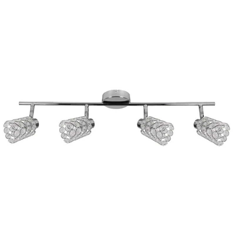 Materiał wykonania: klosz metal z kryształkami, podstawa metalowa. Kolor podstawy: chromowy. Wysokość: 17. Szerokość: 74. Głębokość: 8. Wymiary (wys. x szer. x gł.): 17x74x8. Waga netto: 1,00. Rodzaj trzonka: G9.