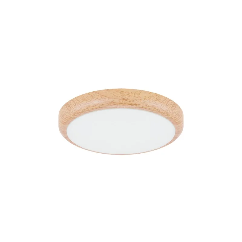 Okrągła plafoniera LED NASTIA to doskonałe rozwiązanie oświetleniowe oferujące różne zastosowania. Plafon LED z tworzywa sztucznego imitującego drewno sosnowe posiada możliwość samodzielnego ustawienia jednej z trzech temperatur barwowych: ciepłobiałej, neutralnej białej lub zimnobiałej, dzięki czemu sprawdzi się zarówno w pomieszczeniach użytkowych, publicznych czy korytarzach lub sypialniach. Model działa z mocą 18W na poziomie max 2070 lm strumienia świetlnego. Równie ważna jest inna cecha nowych plafonier, a mianowicie możliwość zamontowania ich w sposób podtynkowy (przy użyciu sprężyn, w otworze wywierconym np. w płycie gipsowo-kartonowej) lub natynkowy (na suficie, przy użyciu kołków montażowych). Plafon sufitowy NASTIA dostępny jest w kolorze białym oraz we wzorze imitującym drewno sosnowe w mocach 14W lub 18W. Produkt posiada 2 letnią gwarancję. Średnica oprawy wynosi 22,5cm, jej wysokość to 2,8 cm, a średnica otworu montażowego w przypadku montażu podtynkowego to 15 cm.
