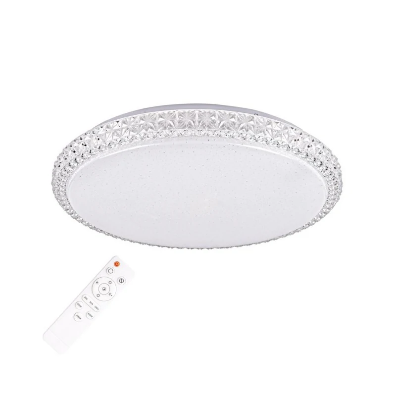 Plafoniera sufitowa IRINA marki POLUX to doskonałej jakości oświetlenie w dekoracyjnym wydaniu. Lampa sufitowa o średnicy 50cm obsługiwana pilotem świeci w zakresie 3 barw: od ciepłej białej, przez neutralną, aż po zimną. Jest to energooszczędne oświetlenie o maksymalnej mocy 68W należące do wysokiej klasy energetycznej z żywotnością aż do 25000 godzin. Dzięki dołączonemu do zestawu pilotowi jesteśmy w stanie obsługiwać oświetlenie nie wstając z łóżka ( zmiana barwy lub natężenia światła). Produkt objęty jest 2-letnią gwarancją. Wymiary oprawy to 500x500x70 mm. Produkt posiada regulowaną jasność w zakresie do 7500 lumenów. Oprawa sufitowa na pilota przeznaczona jest do użytku wewnątrz pomieszczeń. Oprawa dodatkowo posiada klosz z ozdobnym ornamentem na około oraz powierzchnię imitująca gwiaździste niebo ( efekt po włączeniu światła), co czyni ją nie tylko oszczędnym źródłem światła, ale i dekoracyjnym akcentem oświetleniowym w salonach, hotelach, pokojach czy sypialniach.