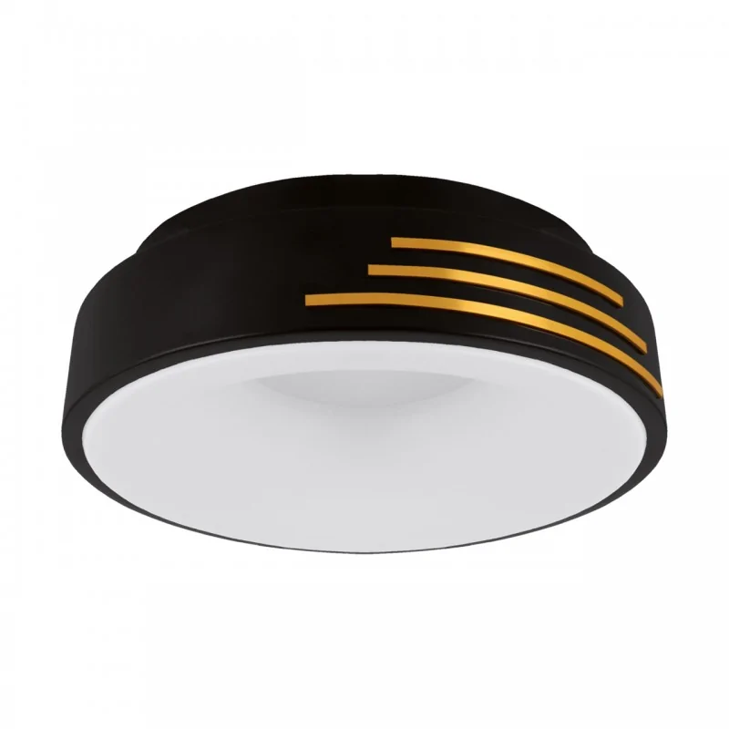 Plafoniera LIBRUS marki IDEUS to nowoczesna lampa w czarnej obudowie, ozdobiona trzema złotymi paskami. Produkt działa z mocą 24W i oddaje neutralne dzienne światło o temperaturze barwowej 4200K oraz strumieniu świetlnym równym 1670 lumenów. Czarna okrągła lampa świetnie spisze się w salonie czy przedpokoju. Jej wymiary to 9,5x38cm. Prezentowany plafon LED wyposażony został w zintegrowane diody SMD LED, których szacowany czas działania to około 30000h. Wysoka jakość wykonania lampy z blachy stalowej i tworzywa sztucznego gwarantuje długą żywotność produktu.