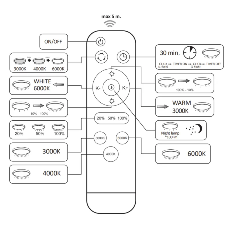 Nowoczesny biały okrągły plafon LED DESERT II marki SANICO to eleganckie oświetlenie, które idealnie nada się do salonu czy sypialni. Do zestawu został dołączony pilot, dzięki czemu możesz włączać i wyłączać lampę, zmieniać barwę światła w zakresie 3000K-6000K (ciepła-neutralna-zimna) oraz regulować jasnością światła nie wstając nawet z łóżka. Ze względu na podwyższony stopień odporności IP44 plafon LED może być zastosowany również w łazience. Do lampy LED nie dołączono baterii do pilota, należy dokupić je oddzielnie (2xAAA). Produkt świeci z maksymalną mocą 72W: 3000K, 4000K- 36W, 4000K, 8000lm- 72W oraz 6000K, 4000lm- 36W. Szacowany czas działania okrągłej plafoniery LED to 48x6,5cm.