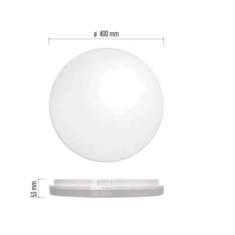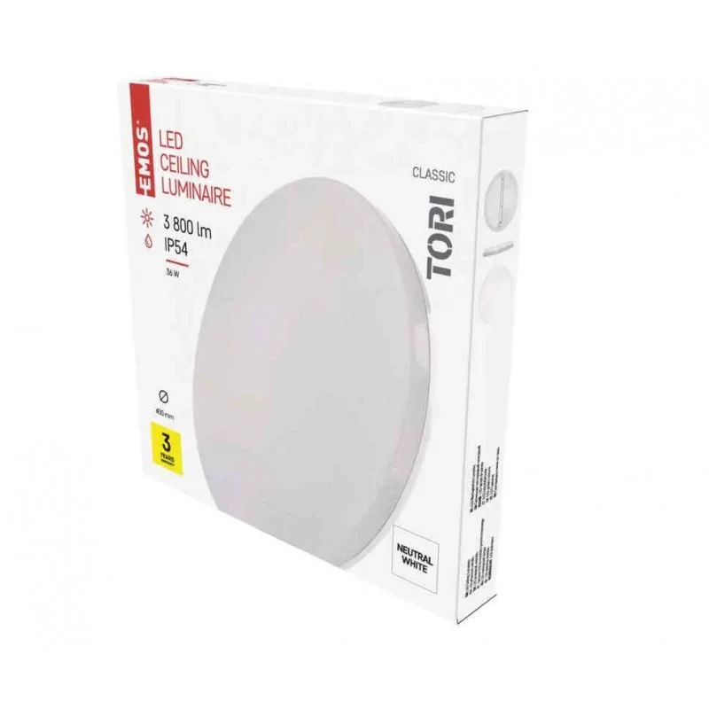 Plafon ZM4325 z kolekcji TORI, przystosowany jest do montażu natynkowego. Jest to produkt marki EMOS, który posiada wbudowany LED, charakteryzujący się energooszczędnością i długą żywotnością. Pobiera moc 36W, co odpowiada 125W tradycyjnej żarówki. Lampa świeci neutralną barwą światła, równą 4000K, która jest najbardziej zbliżona do naturalnego światła. Oświetlenie sufitowe o średnicy 40cm, ma wysoki stopień odporności wynoszący IP54 więc nadaje się do zamontowania na balkonie, w ogrodzie czy warsztacie. Produkt objęty jest trzyletnią gwarancją producenta.