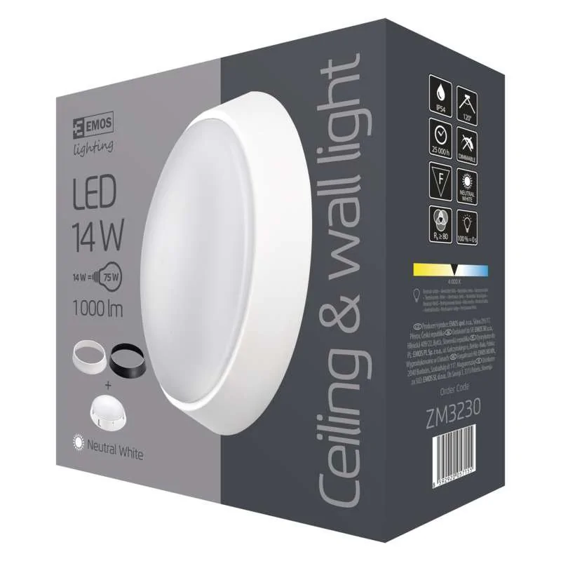 Okrągła oprawa LED ZM3230 firmy EMOS emituje neutralną białą barwą światła o temperaturze barwowej 4000K. Strumień świetlny produktu równy jest 1000 lumenów. Plafoniera LED odporna jest na pył i wilgoć, dzięki czemu może być stosowana również na zewnątrz, a jej stopień ochronności to IP54. Produkt jest w kształcie koła i przeznaczony został do montażu natynkowego. Przybliżony czas żywotności jego zintegrowanego źródła światła LED to około 25000h. Oprawa LED rozsyła światło pod kątem 120 stopni. Wymiary lampy to: 215 x 80 mm.