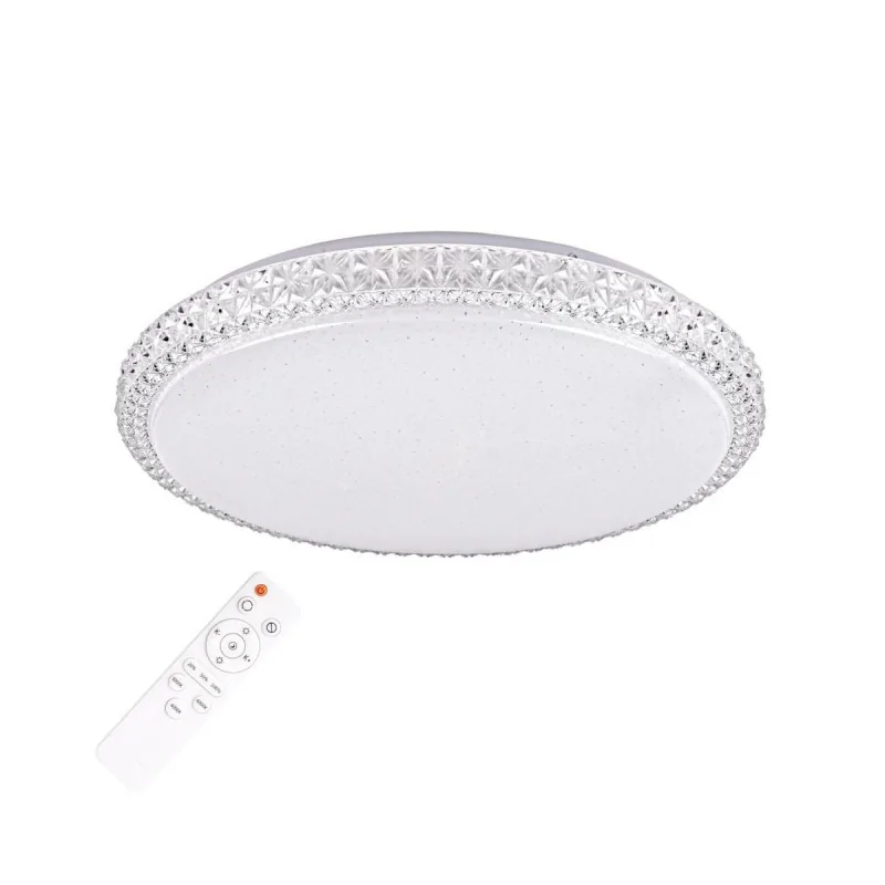 Plafoniera sufitowa IRINA marki POLUX to doskonałej jakości oświetlenie emitujące światło w zależności od potrzeb użytkownik. Lampa sufitowa o średnicy 40cm obsługiwana pilotem świeci w zakresie barw: od ciepłej białej, przez neutralną, aż po zimną. Jest to energooszczędne oświetlenie o maksymalnej mocy 48W należące do wysokiej klasy energetycznej. Oprawa charakteryzuje się bardzo długą żywotnością. Czas pracy oświetlenia sięga aż 25000 godzin. Dzięki dołączonemu do zestawu pilotowi jesteśmy w stanie obsługiwać oświetlenie nie wstając z łóżka( zmiana barwy lub natężenia światła). Produkt objęty jest 2-letnią gwarancją. Wymiary oprawy to 400x400x70 mm. Produkt posiada regulowaną jasność w zakresie od 5200 lumenów. Oprawa sufitowa na pilota przeznaczona jest do użytku wewnątrz pomieszczeń. Oprawa dodatkowo posiada klosz z ozdobnym ornamentem na około oraz powierzchnię imitująca gwiaździste niebo ( efekt po włączeniu światła).
