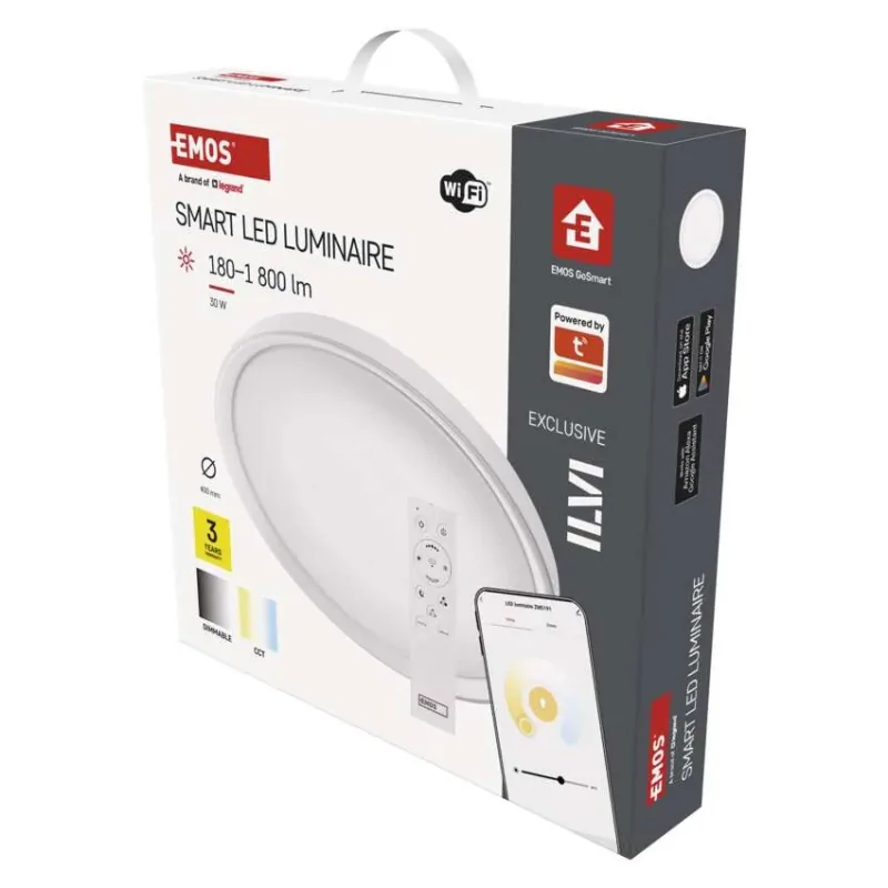 Inteligentny plafon ZM5191 marki EMOS, to nowoczesna forma oświetleniowa dla fanów technologii i wygody. Sterowany jest poprzez aplikację GoSmart, którą należy zainstalować na smartfonie, wymagany jest dostęp do WI-FI. Umożliwia zdalnie wyłączanie i wyłączania oprawy. Lampa nadaje się do powieszenia na suficie jak i na ścianie. Dołączony do zestawu pilot umożliwia wybieranie barwy światła od ciepłej (2700K) do zimnej (6500K), dzięki czemu dobierzemy barwę do własnych preferencji. Lampa posiada wbudowane źródło światła LED o mocy 30W, co jest odpowiednikiem 110W tradycyjnej żarówki. Oświetlenie przystosowane jest do użytku w suchych pomieszczeniach, stopień ochronny to IP20. Średnica klosza wynosi 40cm, natomiast wysokość to 7cm. Produkt objęty jest 3-letnią gwarancją producenta.