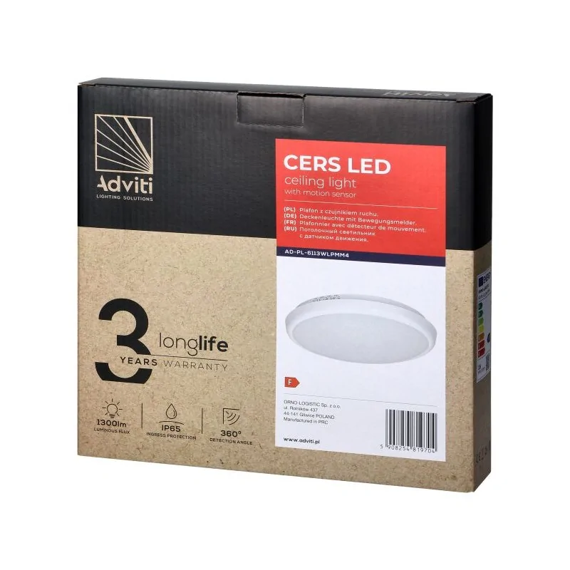 Plafon CERS marki ORNO, przeznaczony do automatycznego oświetlania wewnętrznych i zewnętrznych części pomieszczeń takich jak: klatki schodowe, korytarze, piwnice, garaże, pomieszczenia gospodarcze, szatnie, toalety, oświetlenie zewnętrzne budynków, itp. Lampa sufitowa wyposażona jest w diody LED SMD o przedłużonej żywotności, które pozwalają na znaczne obniżenie kosztów zużycia energii elektrycznej. Świeci neutralną barwą światła, równą 4000K o mocy 15W. W plafonie wbudowano też mikrofalowy czujnik ruchu oraz czujnik zmierzchowy, który w zależności od ustawień załącza oświetlenie tylko wtedy, gdy jest taka potrzeba. Dodatkowo czujnik posiada funkcję przyciemnienia do 20% swojej mocy w wybranym czasie. Odporny na uderzenia klosz wykonany jest z wysokiej jakości poliwęglanu.