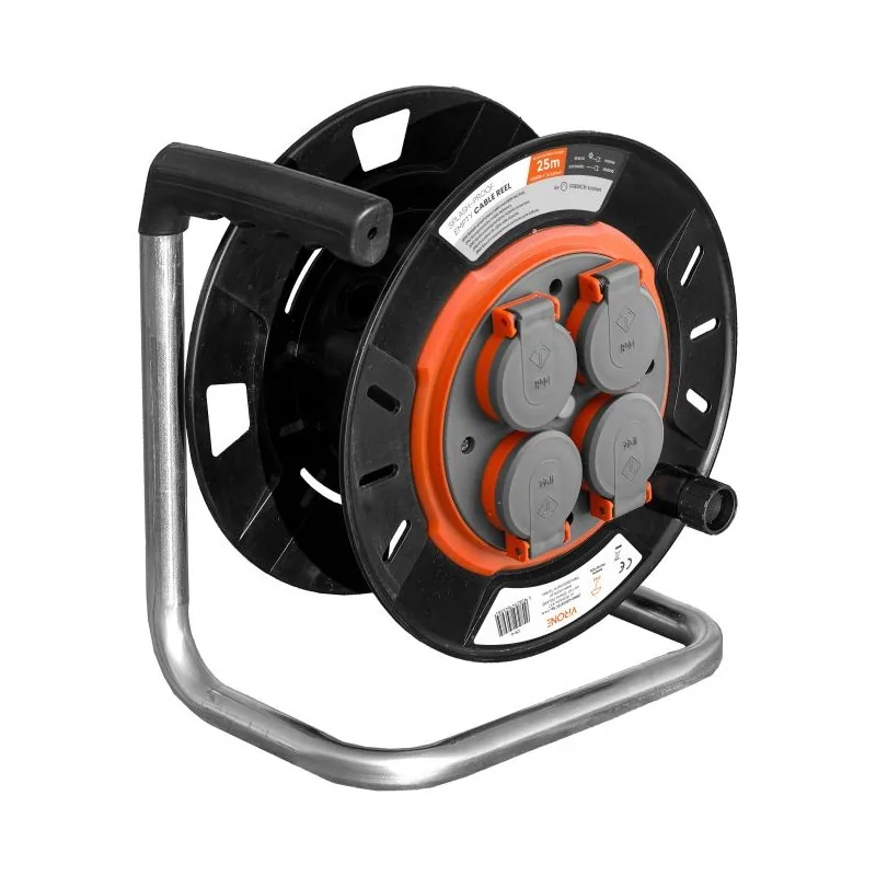 Nawijak bębnowy przystosowany jest do kabla o długości 25m z zalecanym przekrojem 3x1,5mm2 H05RR-F z gumową izolacją. Produkt wyposażony został w 4 hermetyczne gniazda zabezpieczone klapką oraz wygodny uchwyt do przenoszenia i uchwyt korbowy do zwijania kabla.