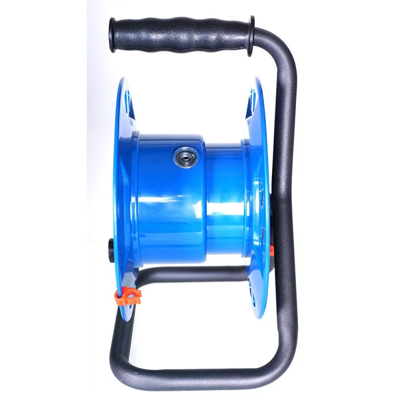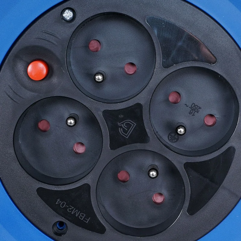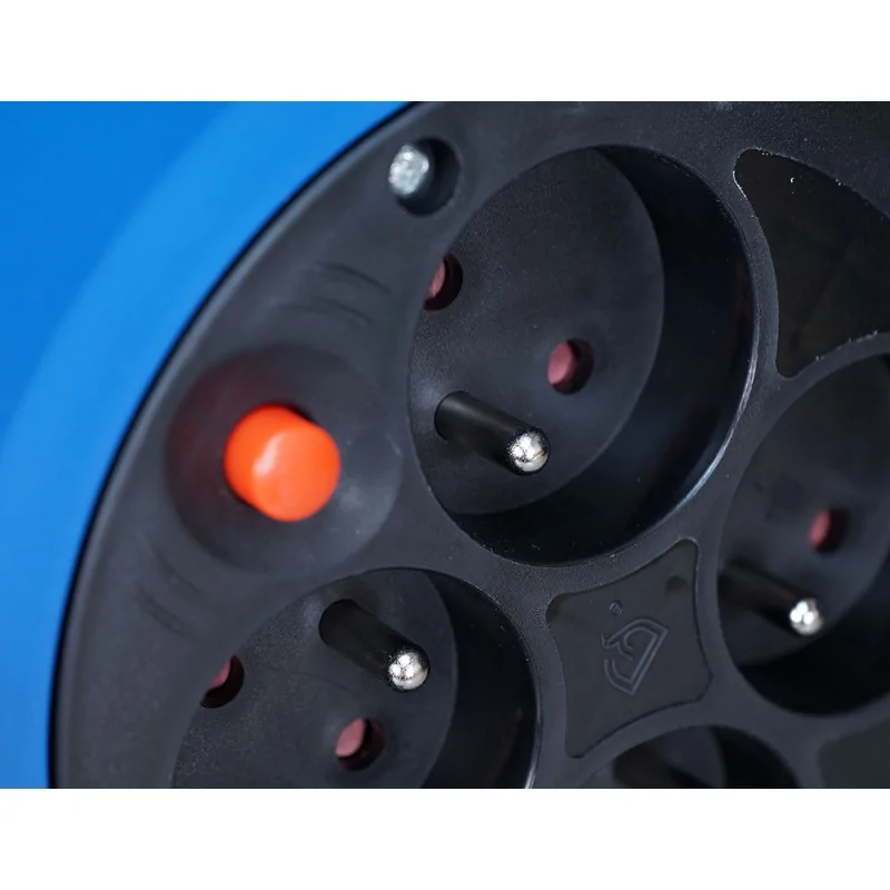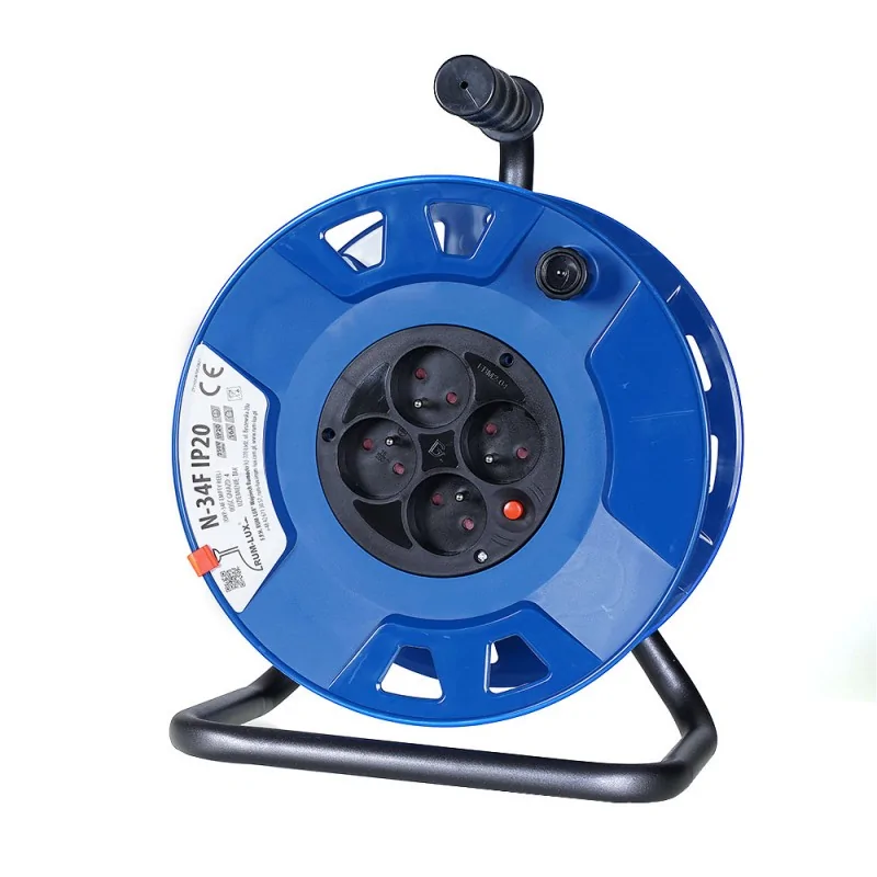 Bęben zwijak BLUE N-34F marki RUM-LUX, z gniazdami do przewodów elektrycznych, przedłużaczy i kabli. Wykonany jest z elastycznego tworzywa sztucznego, osadzony na metalowej konstrukcji. Wyposażony w 4 gniazda z uziemieniem (4 x 10A), został zabezpieczony termicznie, dzięki czemu zapobiega uszkodzeniu oraz przeciążeniu przedłużacza. Przedłużacz przystosowany jest do użytku w pomieszczeniach, stopień ochrony wynosi IP20. Gumowa rączka zapewnia dobry uchwyt oraz łatwe przenoszenie oraz ułatwia zwijanie i rozwijanie przedłużacza. Blokada bębna zapobiega niepożądanemu rozwinięciu się przewodu, natomiast klips przesuwny umożliwia zapięcie końcówki przewodu, co ułatwi jego przechowywanie oraz przenoszenie. Długość przewodu mieszczącego się na zwijaku: max. 3x1,5mm² 50m. Nawijak dostępny jest w dwóch wersjach.