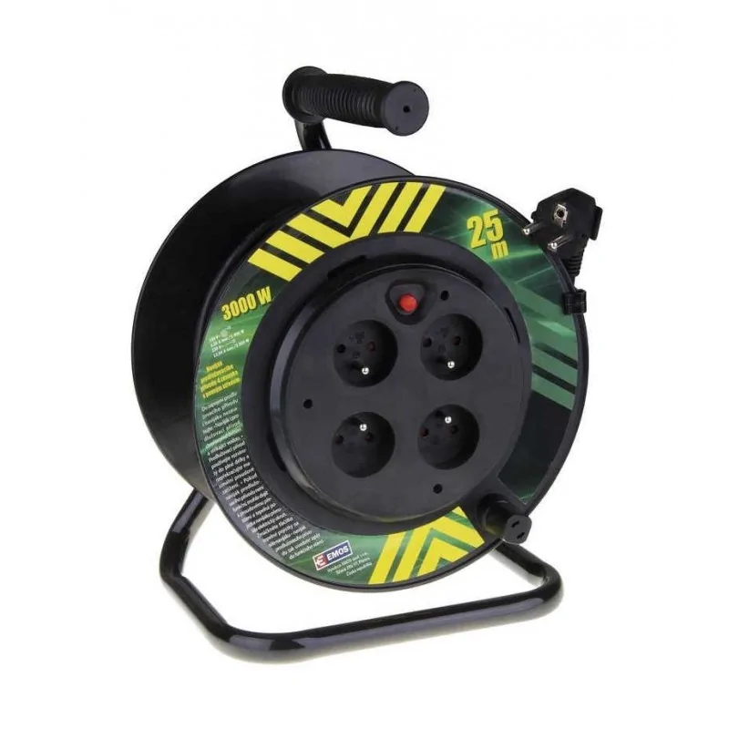 Przedłużacz zwijany na bębnie marki EMOS wyposazony został w cztery gniazda z uziemieniem. Długość przewodu wynosi 25m. Wysoka jakość wykonania gwarantuje długą żywotność produktu. Do przedłużacza bębnowego można podłączyć urządzenia o maksymalnej łącznej mocy 3000W. Przedłużacz działa z tradycyjnym napięciem 230V i wyposażony został w przewód o przekroju 1,5 mm² (żyła H05VV-F3G).