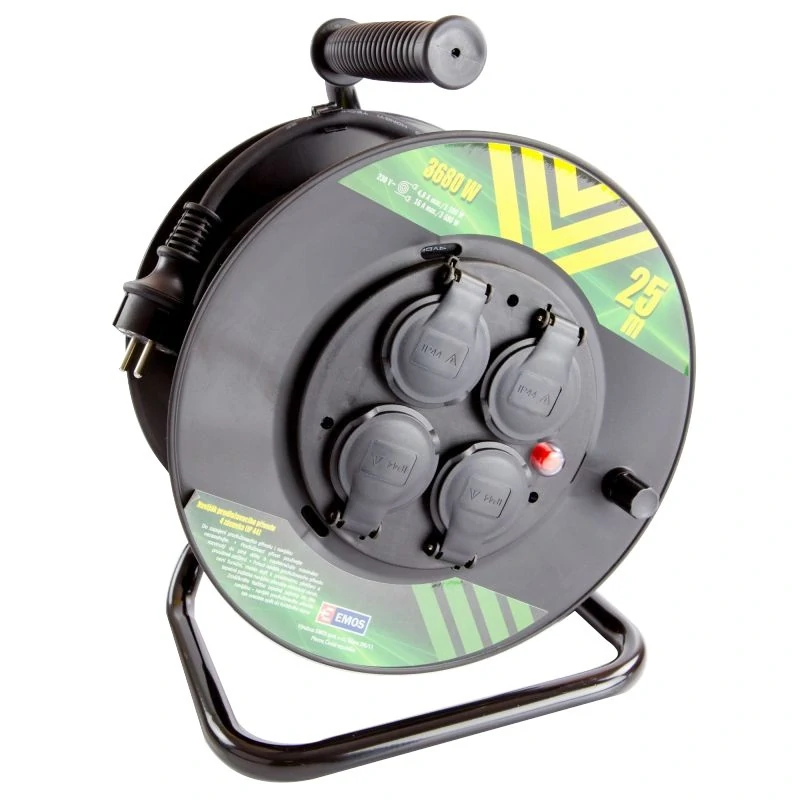 Czarny bębnowy przedłużacz P084253 firmy EMOS to sprzęt, który znajdzie zastosowanie w każdym gospodarstwie domowym i nie tylko. Wszędzie tam gdzie potrzebujemy doprowadzić zasilanie do odległych punktów, długi 25 metrowy przedłużacz szpulowy spełni swoje zadanie. Posiada 4 gniazda z przesłoną torów prądowych, uziemieniem i klapkami samozamykającymi zabezpieczającymi przed wnikaniem pyłu i wody. Jednocześnie do przedłużacza możemy podłączyć urządzenia o łącznej mocy 3680 W przy całkowicie rozwiniętym przedłużaczu. Przewód przedłużacza ogrodowego firmy EMOS wyposażony jest w trzy żyłowy kabel o przekroju 2.5mm2 w izolacji gumowej dzięki czemu może być używany w niekorzystnych warunkach atmosferycznych. Dodatkowo przedłużacz szpulowy posiada bezpiecznik termiczny, zabezpieczający przewód przed stopieniem. Wygodna konstrukcja przedłużacza bębnowego pozwala na rozwinięcie tylko potrzebnej długości kabla.