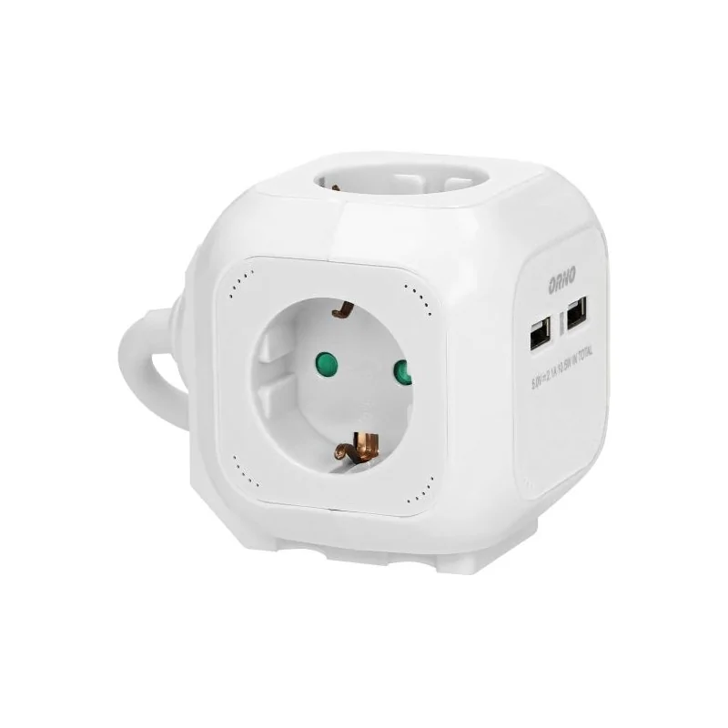 Przedłużacz marki ORNO w kolorze białym z 4 gniazdami z uziemieniem w wersji SCHUKO oraz przesłonami torów prądowych to bezpieczne urządzenie elektryczne w kształcie poręcznej kostki. Przedłużacz sześcian o długości przewodu 1,4 przeznaczony jest do użytku wewnętrznego. Dodatkowo wyposażony jest w 2 wejścia USB. To doskonałe urządzenie pozwalające na podłączenie 4 urządzeń zasilanych prądem elektrycznym jednocześnie do mocy 2300W, a także idealny przedłużacz sieciowy dla urządzeń, gdzie bezpośredni kontakt z gniazdem elektrycznym jest niedostępny.