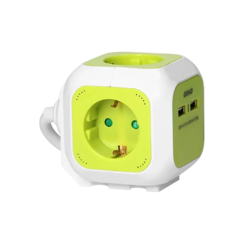 Przedłużacz marki ORNO w kolorze limonkowym z 4 gniazdami z uziemieniem w wersji SCHUKO oraz przesłonami torów prądowych to bezpieczne urządzenie elektryczne w kształcie poręcznej kostki. Przedłużacz sześcian o długości przewodu 1,4 przeznaczony jest do użytku wewnętrznego. Dodatkowo wyposażony jest w 2 wejścia USB. To doskonałe urządzenie pozwalające na podłączenie 4 urządzeń zasilanych prądem elektrycznym jednocześnie do mocy 2300W, a także idealny przedłużacz sieciowy dla urządzeń, gdzie bezpośredni kontakt z gniazdem elektrycznym jest niedostępny.