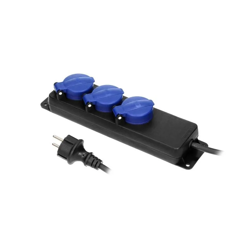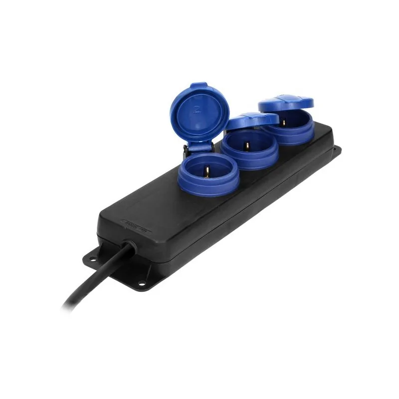 Czarny przedłużacz, ogrodowy typu SCHUKO, z kablem o izolacji gumowej. Posiada 3 gniazda sieciowe z uziemieniem SCHUKO i przesłonami torów prądowych oraz pokrywami uszczelniającymi, które chronią przed zabrudzeniami i wilgocią. Kabel zasilający marki ORNO, ma zawieszkę, która ułatwia montaż w bezpiecznym miejscu oraz otwory służące do stałego montażu na stanowisku pracy. Przedłużacz dedykowany jest do użytku na zewnątrz i mierzy 5 metrów długości. Ten model dostępny jest o różnych wymiarach.