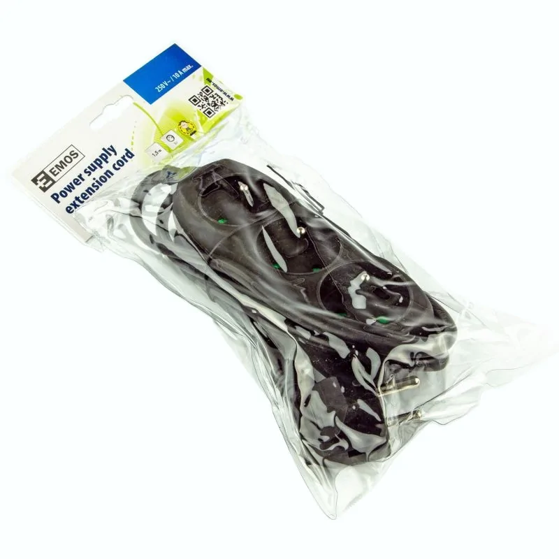 Przedłużacz elektryczny marki EMOS w kolorze czarnym posiada trzy gniazda wyposażone w uziemienie oraz przesłony torów prądowych. Przedłużacz prądowy posiada półtora metrowy przewód dzięki czemu jest w stanie zasilić jednocześnie trzy urządzenia obsługiwane prądem elektrycznym znajdujące się w niewielkiej odległości od gniazda stacjonarnego. Przedłużacz przeznaczony jest do użytku wewnętrznego. Wykonany z najlepszej jakości materiałów elektryczny przedłużacz 1,5 m gwarantuje funkcjonalność oraz bezpieczeństwo użytkowania na lata.