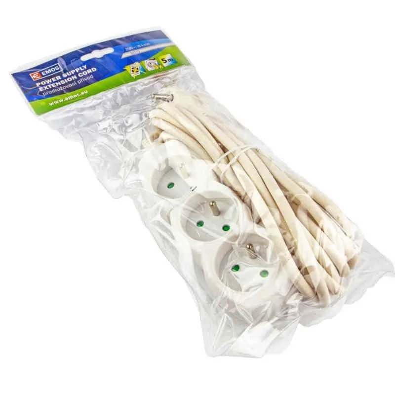 Przedłużacz elektryczny marki EMOS w kolorze białym pozwala na obsługę trzech urządzeń zasilanych prądem elektrycznym jednocześnie. Przedłużacz EMOS posiada trzy gniazda wyposażone w uziemienie oraz przesłony torów prądowych, dzięki czemu jest bezpieczniejszy od przedłużaczy tradycyjnych o podstawowym wyposażeniu. Pięciometrowy kabel przedłużacza pozwala na wygodne korzystanie z prądu elektrycznego niemal z każdego miejsca w domu. Przedłużacz przeznaczony jest do użytku wewnętrznego.