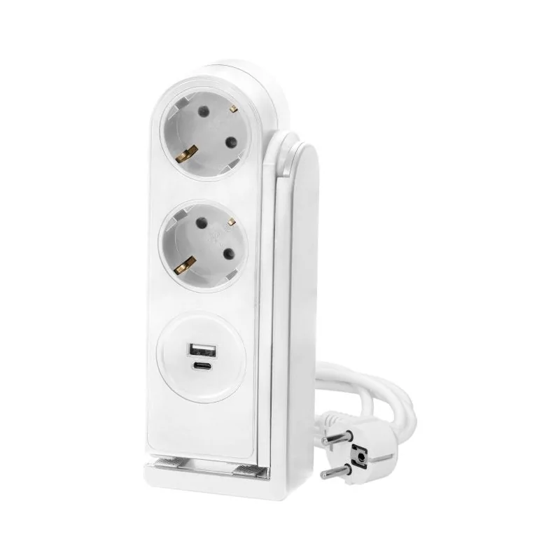 Biały przedłużacz biurkowy marki ORNO wyposażony jest w 2 gniazda elektryczne z uziemieniem w wersji SCHUKO oraz 2xUSB z wejściem A+C, co pozwala na jednoczesne podłączenie dwóch urządzeń o max. łącznej mocy do 3680W oraz ładowanie kablem USB dwóch urządzeń mobilnych. Prezentowany przedłużacz posiada białą obudowę oraz przewód o długości 1,4m. Dodatkowo wyposażony został w zaczep ułatwiający montaż przy biurku.