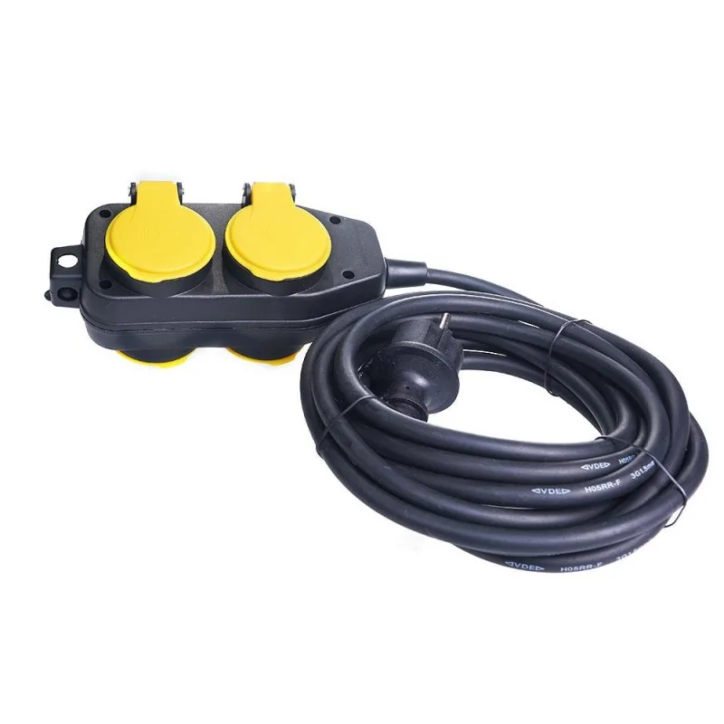 Przedłużacz budowlany 10m, wyposażony został w 4 gniazda z klapką. Trójżyłowy kabel o przekroju 3x1,5mm, w gumowej osłonie, gwarantuje trwałość i niezawodność. Dla większej wygody, przedłużacz na budowę posiada hak do zawieszenia. Cała konstrukcja przedłużacza, posiada stopień ochrony IP44.