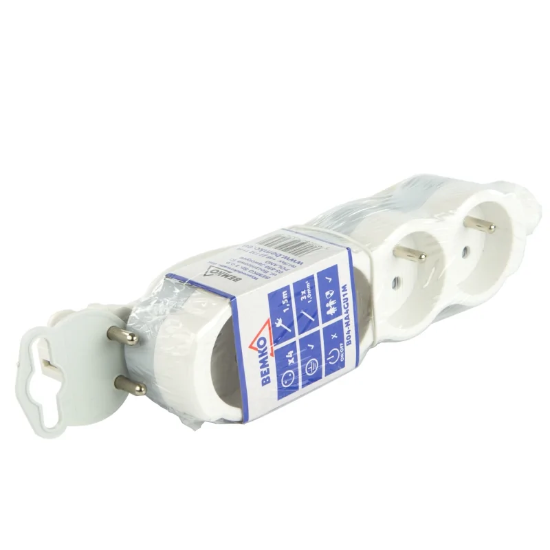 Przedłużacz marki BEMKO o długości przewodu zasilającego 1,5m posiada cztery gniazda z uziemieniem oraz przesłonami torów prądowych. Proponowany przedłużacz elektryczny wykonany jest z dobrej jakości materiałów z dbałością o najmniejsze szczegóły dlatego też nie stanowi najmniejszego zagrożenia dla dzieci. Cztery gniazda pozwalają na jednoczesne zasilenie czterech różnych urządzeń o maksymalnej mocy 2500W. Prosta kolorystyka sprawia, że przedłużacz doskonale wpasuje się w każdą przestrzeń pozostając praktycznie niezauważony.