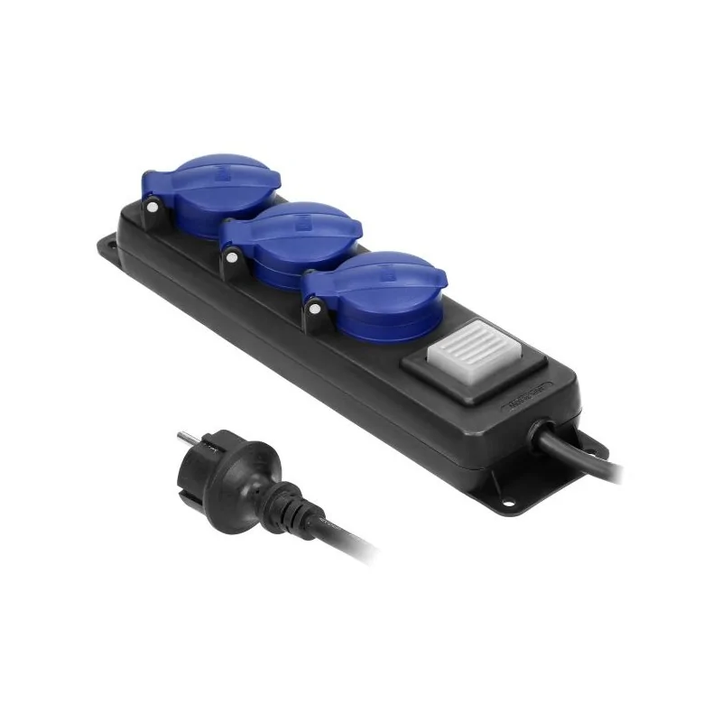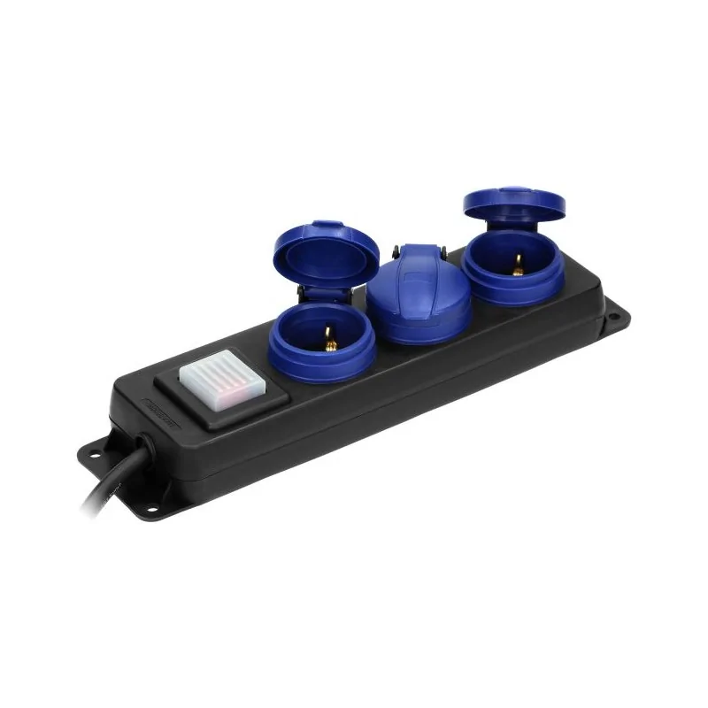 Czarny przedłużacz, ogrodowy typu SCHUKO, z kablem o izolacji gumowej. Posiada 3 gniazda sieciowe z uziemieniem SCHUKO i przesłonami torów prądowych oraz pokrywami uszczelniającymi, które chronią przed zabrudzeniami i wilgocią. Kabel zasilający marki ORNO, ma zawieszkę, która ułatwia montaż w bezpiecznym miejscu oraz otwory służące do stałego montażu na stanowisku pracy. Przedłużacz dedykowany jest do użytku na zewnątrz i mierzy 3 metry. Ten model dostępny jest o różnych wymiarach.