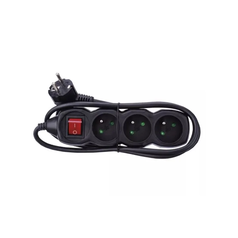 Czarna listwa zasilająca z wyłącznikiem, z przewodem o długości 1,5m PC1311 Emos. Przedłużacz do prądu, posiada 3 gniazda z uziemieniem. Idealnie sprawdzi się tam gdzie nie dociera, gniazdo elektryczne.