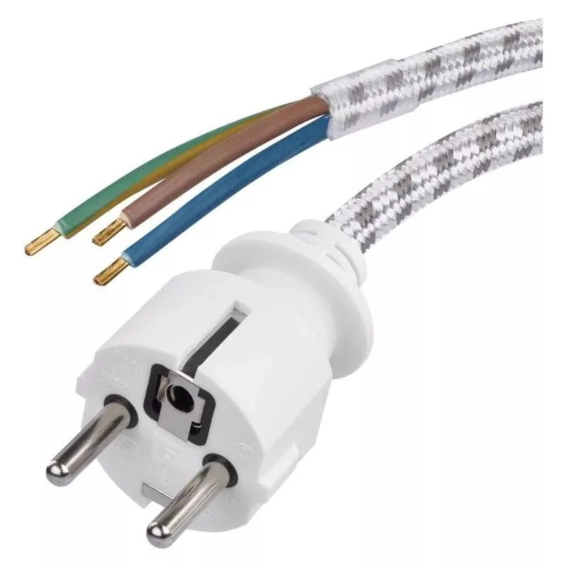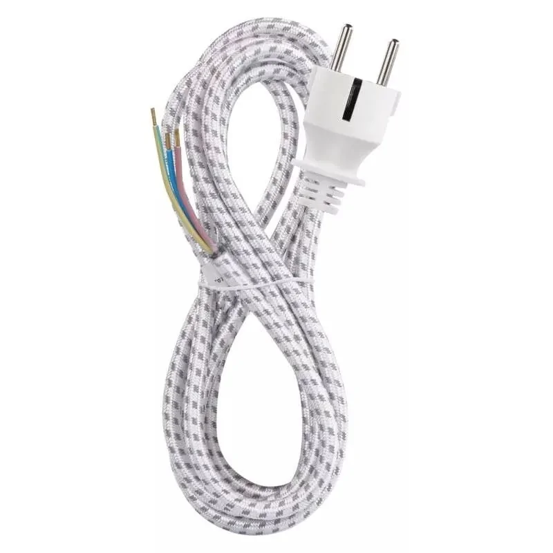 Przewód przyłączeniowy w oplocie marki Emos w uniwersalnym białym kolorze posiada długość 2 ,4metry. Przewód przyłączeniowy zakończony jest okrągłą wtyczką . Przekrój przewodu to 3x0,75mm.