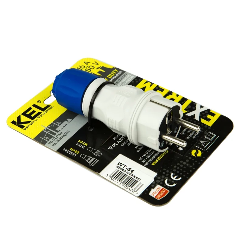 Szaro-niebieska wtyczka WT-54 firmy PLASTROL jest przeznaczona do użytku zewnętrznego i posiada stopień odporności IP54. Wtyczka WT-54 jest wyposażona w uziemienie. Wtyczka zewnętrzna firmy PLASTROL posiada prąd znamionowy równy 16A oraz napięcie znamionowe wynoszące 250V. Dzięki podwyższonej odporności mechanicznej wtyczka nadaje się do pracy na zewnątrz.