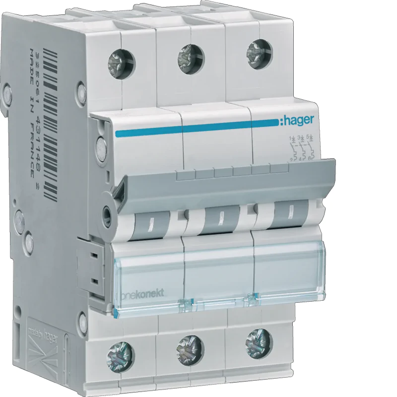 Wyłącznik nadprądowy MCN304E marki HAGER, zapewnia ochronę instalacji elektrycznych przed przeciążeniami i zwarciami, szczególnie w instalacjach domowych i komercyjnych.