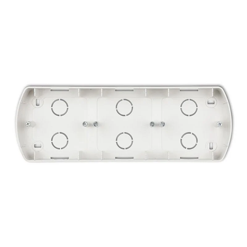 Potrójna puszka montażowa PTH-3 w kolorze białym służy do natynkowego montażu łączników i gniazd. Kompatybilna jest z gniazdami i łącznikami z serii TREND z wyłączeniem łączników: SR-1 sterownik roletowy, RO-1 regulator oświetlenia oraz SH- 1 łącznik hotelowy . Puszka natynkowa pozioma sprawdzi się w miejscach gdzie nie ma możliwości prowadzenia instalacji podtynkowej lub jest to utrudnione. Puszki z serii TREND zapewniają estetyczny wygląd, dostępne są w różnych wersjach kolorystycznych. W ofercie znajdują się również puszki pojedyncze, podwójne oraz puszki natynkowe poczwórne.