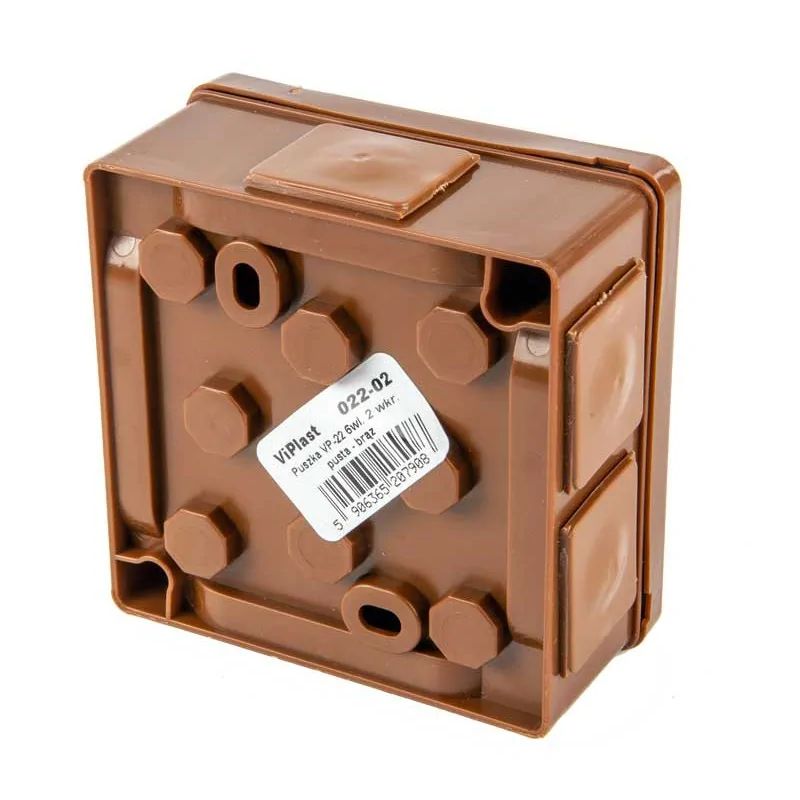 Puszka natynkowa 022-02 firmy ViPlast posiada podwyższony stopień odporności IP55, dzięki czemu może być zamontowana na zewnątrz. Puszka instalacyjna naścienna jest o wymiarach: 86 x 86 x 40 mm. Hermetyczna puszka w kolorze brązowym przeznaczona jest do montażu natynkowego. Puszka wyposażona został w 6 wejść.