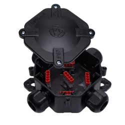 Czarna puszka natynkowa SEZ to niezawodne rozwiązanie do ochrony i łączenia przewodów w instalacjach elektrycznych i elektronicznych. W zestawie znajdują się złączki WAGO, które umożliwiają szybkie, pewne i beznarzędziowe podłączenie przewodów, zapewniając wysoki poziom bezpieczeństwa i estetyki wykonania.