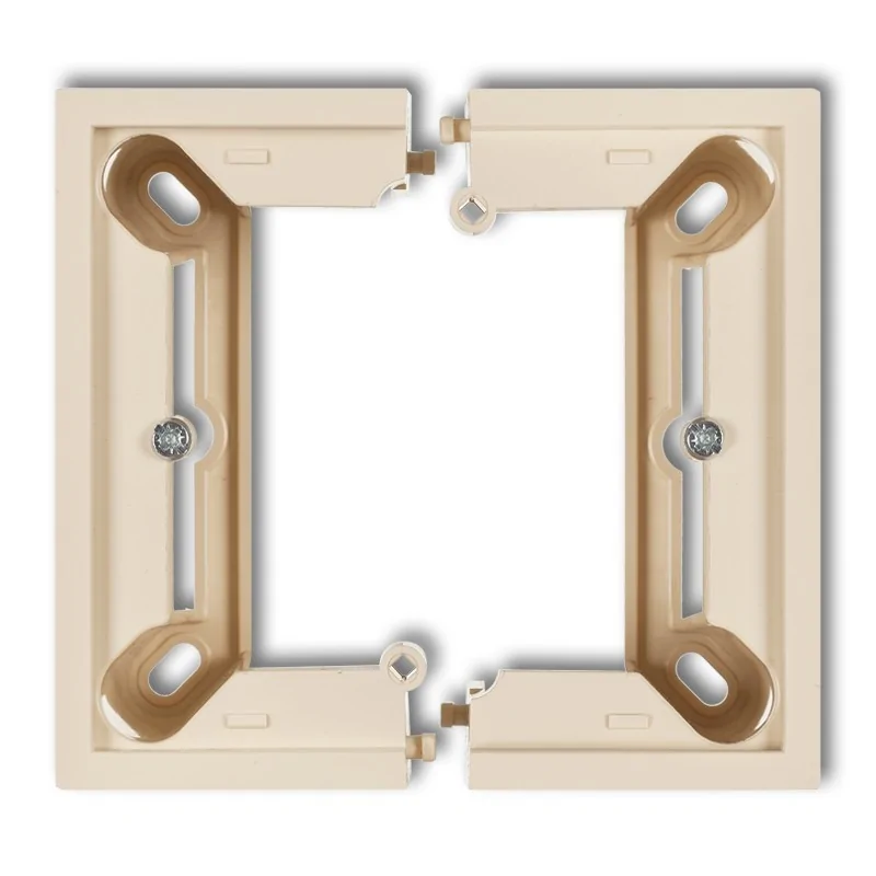 Beżowa puszka natynkowa składana serii DECO oraz MINI firmy KARLIK przeznaczona jest do montażu z osprzętem tej samej serii oraz firmy. Wymiary puszki natynkowej, pojedynczej, składanej DECO, MINI, również w wersji wielokrotnej (powstałej za pomocą modułu rozszerzającego), są zgodne z wymiarami ramek uniwersalnych DECO, MINI. Puszka nie jest kompatybilna z ramkami deco soft.