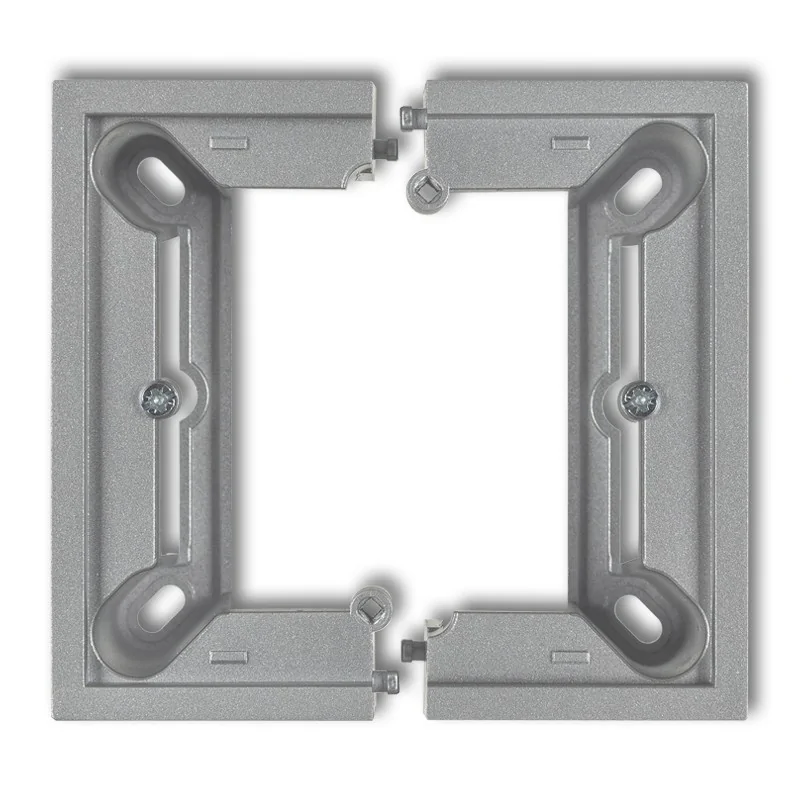 Srebrna puszka natynkowa składana serii DECO oraz MINI firmy KARLIK przeznaczona jest do montażu z osprzętem tej samej serii oraz firmy. Wymiary puszki natynkowej, pojedynczej, składanej DECO, MINI, również w wersji wielokrotnej (powstałej za pomocą modułu rozszerzającego), są zgodne z wymiarami ramek uniwersalnych DECO, MINI. Puszka nie jest kompatybilna z ramkami deco soft.