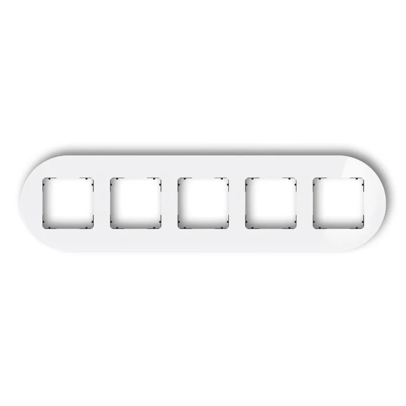 Ramka pięciokrotna okrągła serii ICON firmy KARLIK z efektem szkła w kolorze białym z czarnym spodem. Do ramki należy dokupić osobno mechanizm tej samej serii oraz marki. Ramki instalacyjne ICON dostępne są w wersji okrągłej, zaokrąglonej oraz kwadratowej w krotnościach 1-5, w różnych wersjach kolorystycznych.