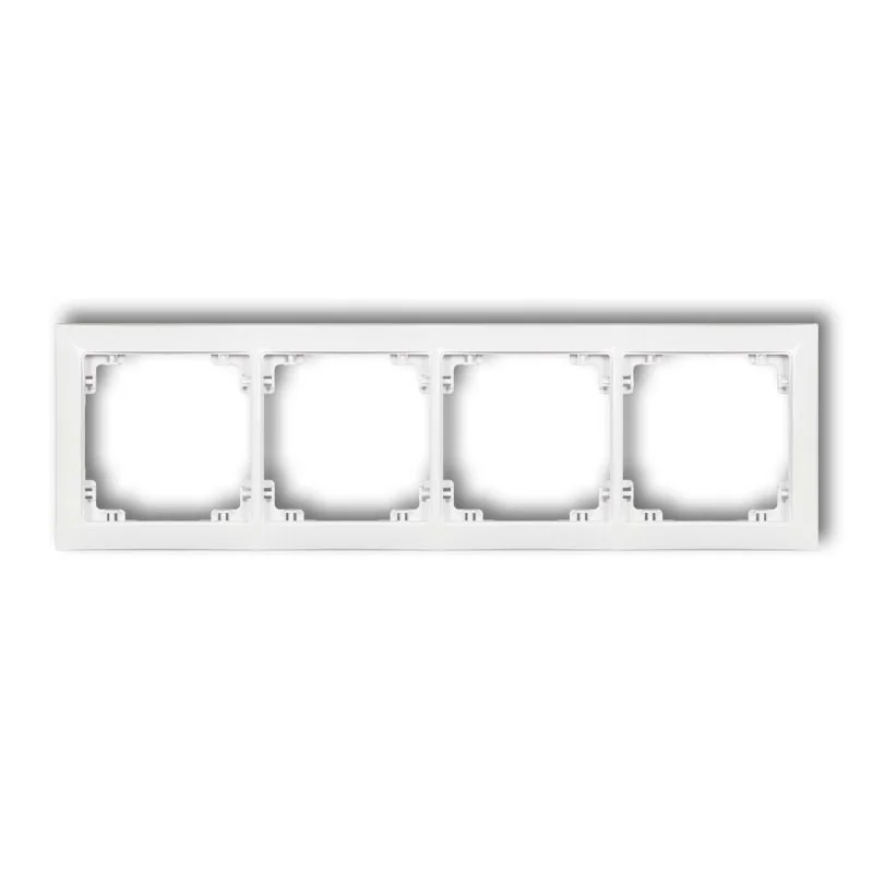 Poczwórna ramka instalacyjna, uniwersalna w kolorze białym serii DECO SOFT firmy KARLIK. Ramki DECO Soft nie są kompatybilne z gniazdami podwójnymi DECO. Do gniazda podwójnego należy kupić ramkę DECO.
