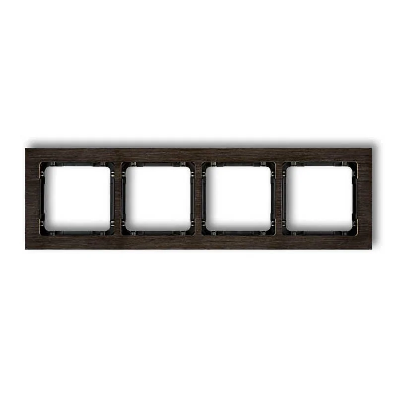 Ramka instalacyjna poczwórna DRD-4G serii DECO firmy KARLIK z efektem drewna wenge. Produkt posiada spód w kolorze czarnym. Mechanizmy i ramki Deco sprzedawane są osobno, dzięki czemu możesz stworzyć własną kompozycję, dopasowując ją do aranżacji danego pomieszczenia. Ramka z efektem drewna dostępna jest w różnych krotnościach- od pojedynczych do pięciokrotnych.