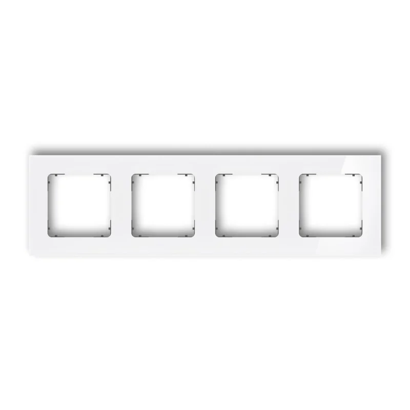 Ramka poczwórna kwadratowa serii ICON firmy KARLIK z efektem szkła w kolorze białym z grafitowym matowym spodem. Do ramki należy dokupić osobno mechanizm tej samej serii oraz marki. Ramki instalacyjne ICON dostępne są w wersji okrągłej, zaokrąglonej oraz kwadratowej w krotnościach 1-5, w różnych wersjach kolorystycznych.