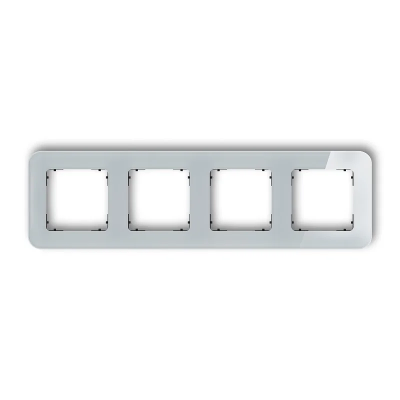 Ramka poczwórna zaokrąglona serii ICON firmy KARLIK z efektem szkła w kolorze szarym z czarnym spodem. Do ramki należy dokupić osobno mechanizm tej samej serii oraz marki. Ramki instalacyjne ICON dostępne są w wersji okrągłej, zaokrąglonej oraz kwadratowej w krotnościach 1-5, w różnych wersjach kolorystycznych.