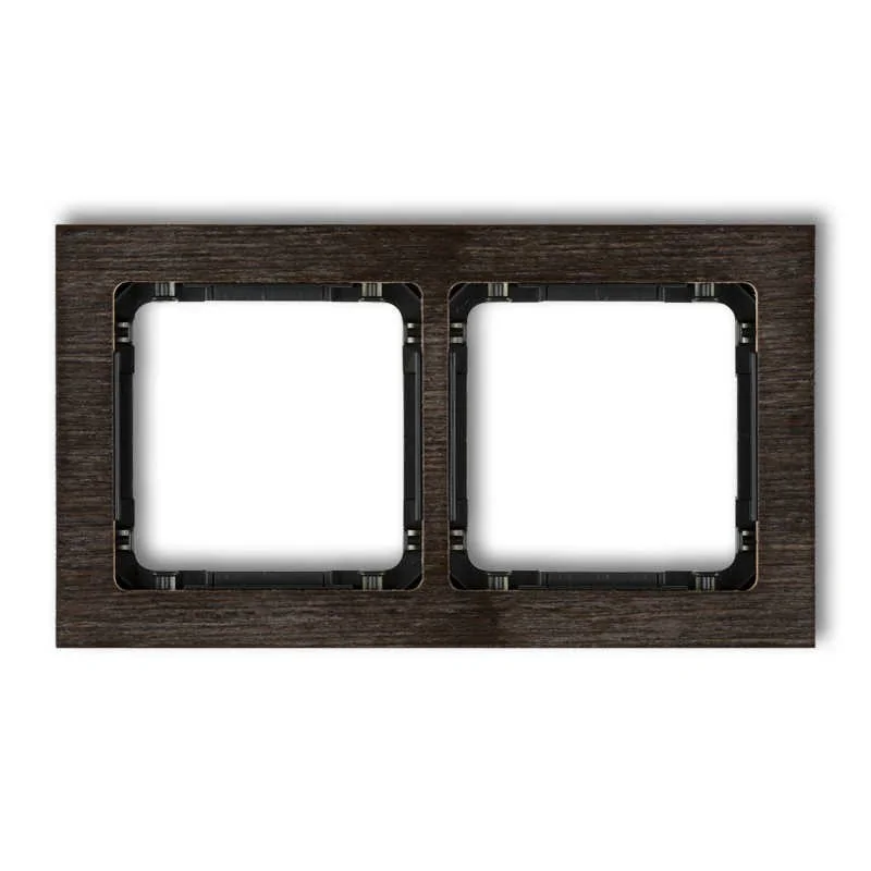 Ramka instalacyjna podwójna DRD-2G serii DECO firmy KARLIK z efektem drewna wenge. Produkt posiada spód w kolorze czarnym. Mechanizmy i ramki Deco sprzedawane są osobno, dzięki czemu możesz stworzyć własną kompozycję, dopasowując ją do aranżacji danego pomieszczenia. Ramka z efektem drewna dostępna jest w różnych krotnościach- od pojedynczych do pięciokrotnych.