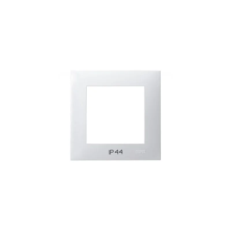 Ramka instalacyjna RH-1Z/00 serii SZAFIR marki OSPEL w kolorze białym. Produkt jest kompatybilny tylko z modułami SZAFIR OSPEL. Ramka posiada podwyższony stopień odporności IP44.