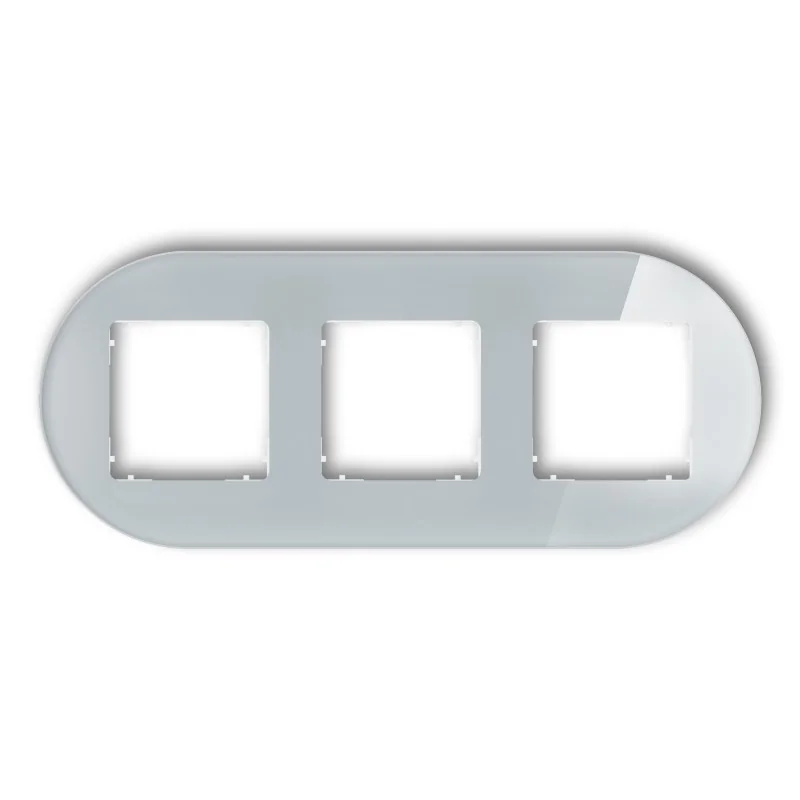 Ramka potrójna okrągła serii ICON firmy KARLIK z efektem szkła w kolorze szarym z białym spodem. Do ramki należy dokupić osobno mechanizm tej samej serii oraz marki. Ramki instalacyjne ICON dostępne są w wersji okrągłej, zaokrąglonej oraz kwadratowej w krotnościach 1-5, w różnych wersjach kolorystycznych.