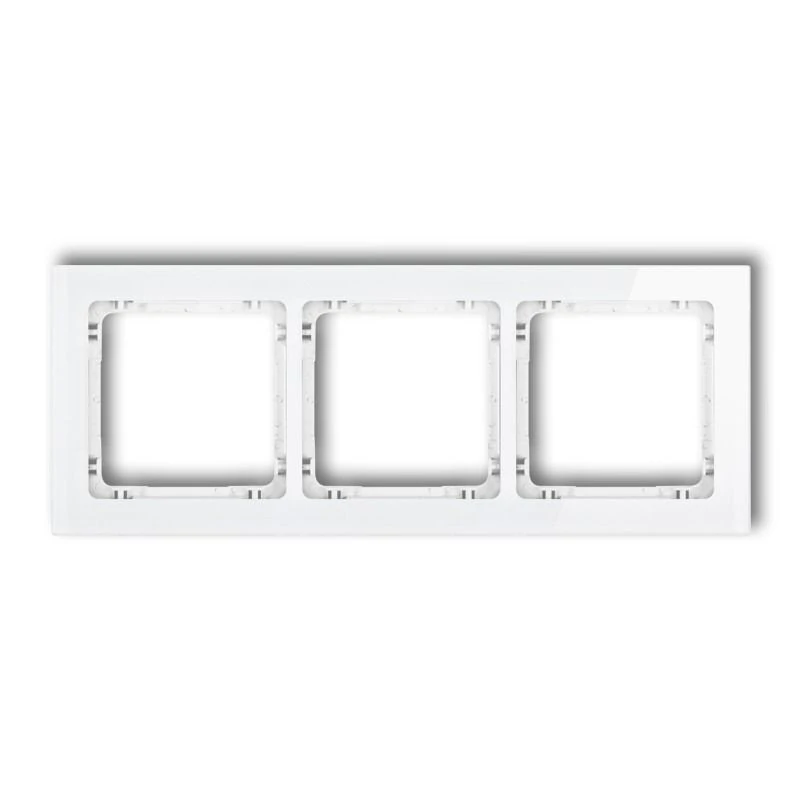Ramka uniwersalna potrójna to model z klasycznym białym spodem i nowoczesnym wykończeniem z efektem szkła. Ramka przeznaczona jest do osprzętu elektroinstalacyjnego z serii DECO marki KARLIK. Produkt został wyprodukowany w Polsce. Wprowadzony szklany efekt nada stylu domowym lub biurowym wnętrzom. Ramka potrójna pozwala na umieszczenie trzech modułów w jednej ramce. Ramka na gniazda elektryczne przeznaczona jest do montażu podtynkowego w pionie lub w poziomie. Dzięki białej kolorystyce pasuje idealnie do kuchni, przedpokojów, biur czy sypialni.