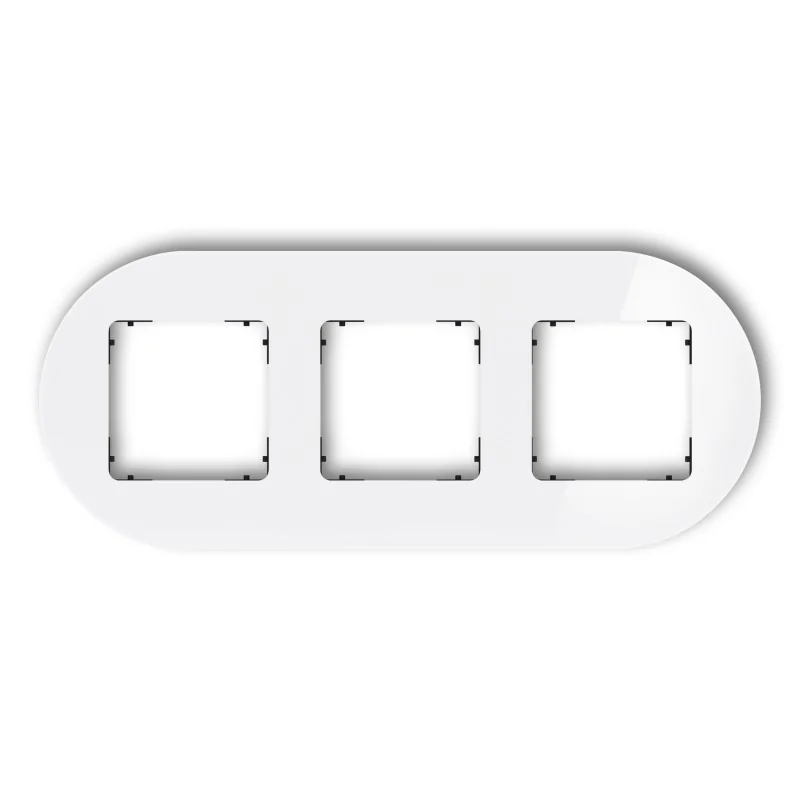 Ramka potrójna okrągła serii ICON firmy KARLIK z efektem szkła w kolorze białym z czarnym spodem. Do ramki należy dokupić osobno mechanizm tej samej serii oraz marki. Ramki instalacyjne ICON dostępne są w wersji okrągłej, zaokrąglonej oraz kwadratowej w krotnościach 1-5, w różnych wersjach kolorystycznych.