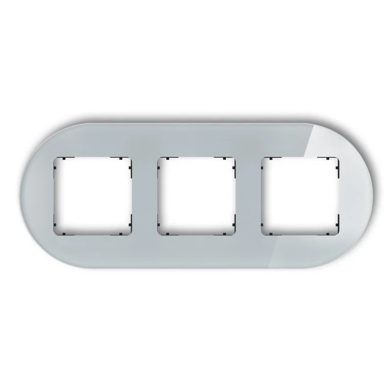 Ramka potrójna okrągła serii ICON firmy KARLIK z efektem szkła w kolorze szarym z czarnym spodem. Do ramki należy dokupić osobno mechanizm tej samej serii oraz marki. Ramki instalacyjne ICON dostępne są w wersji okrągłej, zaokrąglonej oraz kwadratowej w krotnościach 1-5, w różnych wersjach kolorystycznych.