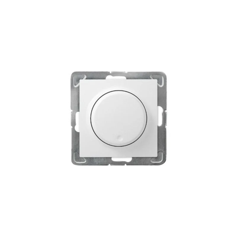 Ściemniacz przyciskowo-obrotowy przystosowany do obciążenia żarowego i halogenowego koloru białego serii IMPRESJA firmy OSPEL, przeznaczony do montażu podtynkowego. Ściemniacz wymaga dokupienia ramki serii IMPRESJA firmy OSPEL.
