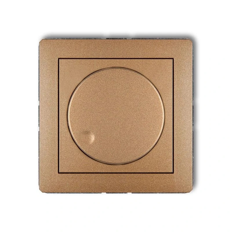 Ściemniacz przyciskowo obrotowy w kolorze złotym serii DECO firmy KARLIK, przeznaczony do montażu podtynkowego. Regulator oświetlenia wymaga dokupienia ramki serii DECO firmy KARLIK.