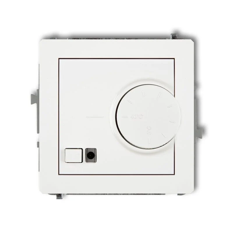 Regulator temperatury z czujnikiem podpodłogowym serii DECO firmy KARLIK w kolorze białym, przeznaczony do montażu podtynkowego. Regulator wymaga dokupienia ramki serii DECO firmy KARLIK.
