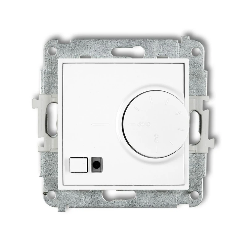 Regulator temperatury z czujnikiem powietrzynym serii MINI firmy KARLIK w kolorze białym, przeznaczony do montażu podtynkowego. Regulator wymaga dokupienia ramki serii MINI firmy KARLIK. Elektroniczny regulator temperatury umożliwia utrzymanie nastawionej temperatury powietrza w sposób automatyczny. Regulator z czujnikiem napowietrznym stosuje się w pomieszczeniach, w których zastosowano dowolny rodzaj ogrzewania (ogrzewanie podłogowe lub za pomocą grzejników). Każdy z obwodów stanowi niezależny system grzejny, który można indywidualnie programować.