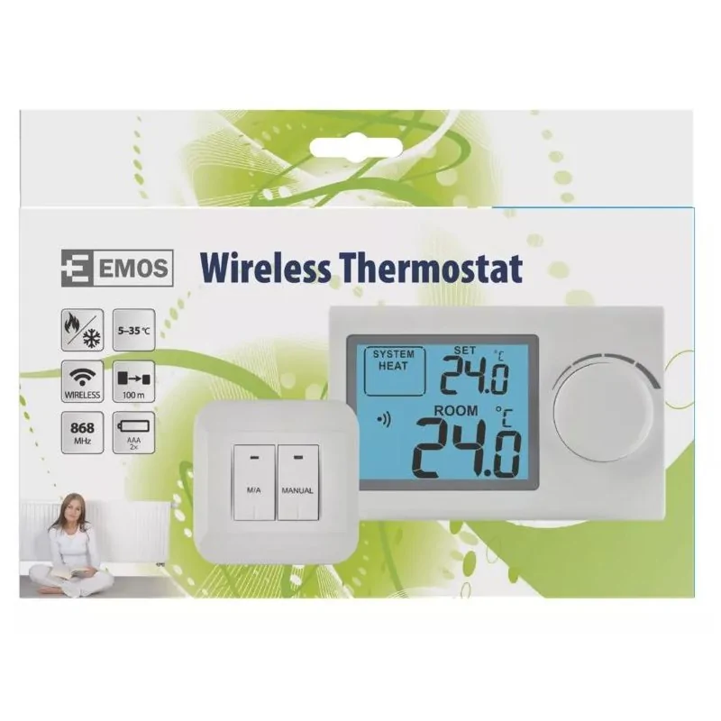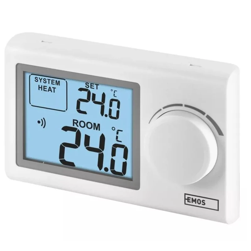 Regulator pokojowy z wyświetlaczem elektronicznym P5614 Emos. Termostat Emos umożliwia sterowanie urządzeniami grzewczymi lub klimatyzacją. Bezprzewodowa komunikacja radiowa 868 MHz, zastosowana w odbiorniku jak i nadajniku, sprawia że nie potrzebne jest dodatkowe okablowanie. W skład zestawu termostatu pokojowego wchodzi jednostka przełączająca, do której podłączone jest urządzenie grzewcze lub chłodnicze. Drugim elementem jest jednostka sterująca, z przejrzystym wyświetlaczem LCD.