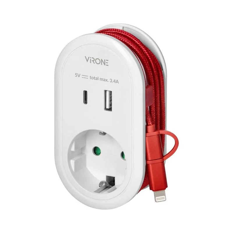 Adapter CS-2(GS) do gniazdka elektrycznego marki ORNO, przyjdzie nam z pomocą, gdy nie mamy do dyspozycji wielu punktów podpięcia zasilania, a chcielibyśmy, na przykład, zorganizować sobie przestrzeń do pracy. Bez konieczności wymiany gniazdka, bez bałaganu i mnożących się pod nogami kabli - pozwala wygodnie uporządkować urządzenia, wymagające zasilania. W domu i w biurze - pozwala za jednym zamachem: podłączyć laptopa, naładować telefon i podpiąć np. podgrzewany kubek z poranną kawą. Rozgałęźnik pozwala zasilać lub ładować dwa urządzenia z gniazd USB (typ A oraz typ C) bez konieczności zajmowania gniazdka elektrycznego. Rozdzielacz posiada też własny kabel zasilający o długości 0,8m, zamknięty w trwałej oplotce (typ C lub lightning). Adapter z ładowarką przystosowany do gniazd typu schuko.