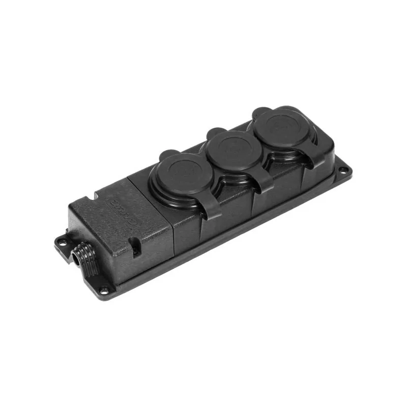 Rozdzielacz warsztatowy o stopniu szczelności IP44. Rozgałęźnik posiada 3 gniazda (2P+Z) z gumową osłoną przeciw rozbryzgom wody i pyłom. Posiada otwór ułatwiający zawieszenie w bezpiecznym miejscu oraz 4 otwory na śruby służące do stałego montażu na stanowisku pracy. Złącze kablowe ukryto pod odkręcaną pokrywą. Do przeprowadzenia kabla służy wbudowany, gumowy przepust kablowy. Rozdzielacz posiada wyjątkowo niski 5cm profil. Model wysoce trwały odporny na uderzenia , uniepalniony idealny do warsztatu czy garażu. Model dostępny w różnych krotnościach.